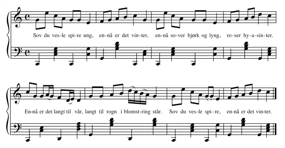 - In 1900 the Danish-Swedish composer Preben Nodermann (1867–1930) published a melody (with minor modifications of Topelius's text) titled Solskenets visa ("Sunshine's song") in Sex visor för barn ("Six songs for children").[7] Danish and Norwegian versions of the song, entitled Solskinnsvise, have become well known and have been published in Norway both as sheet music and as recordings.[8]