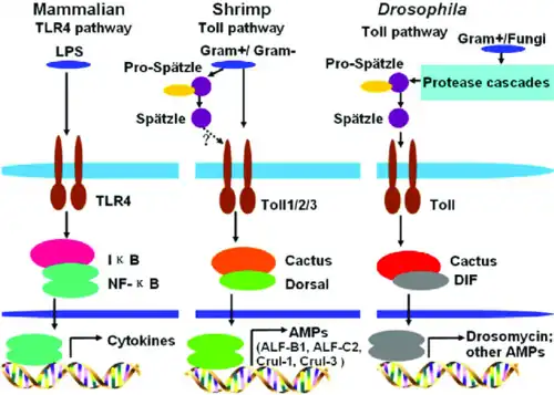 Toll signaling pathways in mammals, shrimp and fruit flies