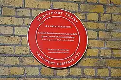 Spa Road railway station was located at the eastern end of the street and was the original terminus of the capital's first railway the London and Greenwich Railway when it opened in 1836. It was rebuilt twice and relocated across the street before closing to passengers in 1915.[3] The viaduct carrying trains from or towards London Bridge station still crosses the street.