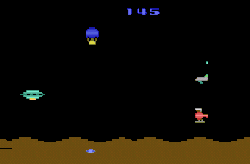 The player controls an "attack saucer" that flies to the right over scrolling, undulating terrain. The saucer only moves vertically and stops just before it hits the ground. The goal is to shoot ground-based tanks and flying enemies: jet planes, propeller planes, helicopters, and hot air balloons.[5]Trees and houses appear on the ground as obstacles which can also be destroyed.