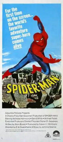 Spider-Man is a 1977 American television superhero film that aired on CBS and had a theatrical release outside the US, which serves as the pilot to the 1977 television series titled The Amazing Spider-Man. It was directed by E. W. Swackhamer, written by Alvin Boretz and stars Nicholas Hammond as the titular character, David White, Michael Pataki, Jeff Donnell and Thayer David.