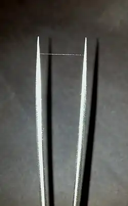 A dragline silk's tensile strength is comparable to that of high-grade alloy steel (450−2000 MPa),[21][22] and about half as strong as aramid filaments, such as Twaron or Kevlar (3000 MPa).[23] According to Spider Silkome Database, Clubiona vigil silk has the highest tensile strength.[18]
