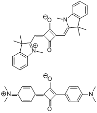 Squarylium dyes are soluble in dichloromethane; it is soluble in few other solvents. Their absorption peaks at ~630 nm and luminescence at ~650 nm.[4] The luminescence is photochemically stable[5] and its quantum yield is ~0.65.[6]