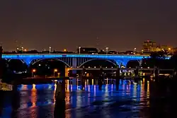 The I-35W Saint Anthony Falls Bridge crosses the Mississippi River one-half mile (875 m) downstream from the Saint Anthony Falls in Minneapolis, Minnesota in the U.S., carrying north–south traffic on Interstate 35W. The ten-lane bridge replaced the I-35W Mississippi River bridge, which collapsed on August 1, 2007. It was planned and is maintained by the Minnesota Department of Transportation (MnDOT). The planning, design, and construction processes were completed more quickly than normal because Interstate 35W is a critical artery for commuters and truck freight.[1] The bridge opened September 18, 2008, well ahead of the original goal of December 24.[6]