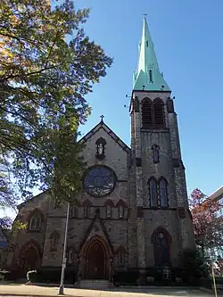 On March 12, 1885, the interior of the church was destroyed in a fire.[4][5] The fire broke out shortly after 10 A.M. in the boiler room on the west side of the church basement. It spread into the church above, eventually engulfing the altar. The church's engineer, Florence McCauliff, housekeeper Kate Duffy, and Officer Burns of the nearby First Precinct Station House rushed to the sanctuary to save articles from the fire. They did not leave until they were driven out by the flames. Officer Burns sustained serious burn injuries to his hands and wrists, but the three were successful in removing everything of value from the altar.[14]