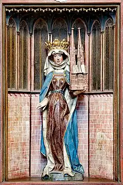 At the corner of the northern (Elisabeth) choir, there is a large mausoleum dating to 1280, which is situated above the spot where Elizabeth was originally laid to rest in St. Francis' Hospital Chapel, before her shrine was moved to the sacristy.[11] The church also contains five significant Gothic altars, the most valuable of which is the polychromed 1290 High Altar.[12] The Altar of the Cross, situated in front of the choir screen, is topped with a crucifix by Ernst Barlach, commissioned in 1931 to commemorate the 700th anniversary of Elizabeth's death. This crucifix was removed from the church in 1936 as an example of Degenerate Art, however, it was spared from destruction and placed back on the altar following the fall of the Nazis.[13]