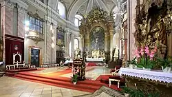 The cathedral has nine altars, belonging to the Rococo and Baroque style, which were sculpted by Johannes Müller.[3] The altars are decorated with icons, and the main altar is flanked by two statues of St. Teresa of Ávila and St. Charles Borromeo, both of which are sculpted by Johann Josef Rößler.[9] The main altar was painted by Michelangelo Unterberger, then director of the Vienna Academy of Fine Arts, and its central part is dominated by statues of two cherubs.[10] The painting above the main altar, made in 1754, also belongs to Unterberger. This depicts St. George in armor on horseback fighting a dragon.[8] The structure of the side altars was made by Timișoara craftsmen Georg Wittmann and Franz Wagner, the necessary materials (marble and wood) being brought from Vienna.[11] They were painted by Johann Nepomuk Schöpf in Prague in 1772.[7] The interior of the cathedral is also notable for its valuable liturgical objects: the silver chandelier from the main altar (the so-called "Eternal Light"), made by the Viennese jeweler Josef Moser, the large, gilded monstrance, a few chalices and the silver ceremonial cross of the cathedral.[1]