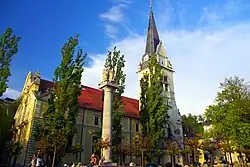 On the side of the church there is a column erected in 1682 to commemorate the Habsburg victory against the Ottoman Turks in the Battle of Saint Gotthard.