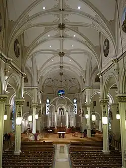 Leading features of the church's interior include a prominent rib vault, two rows of columns in the nave that are topped with Corinthian capitals, and an altar built to resemble that of Rome's Basilica di San Clemente.