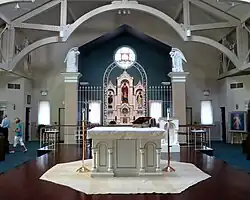Adjacent to the church on the west is a brick rectory; built in 1914, it replaced a small wooden rectory that has since been moved to a different part of the village. Constructed in a vernacular style, it is a square two-story structure with an ashlar foundation and an enclosed front porch. A hip roof of asbestos shingle, pierced by multiple dormers, covers the building. Among its most striking features is a stone cross, located between the second-story windows on the front of the house.[8]