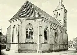 Bishop Ludger baptized at Billerbeck and founded the parish church of St John the Baptist there before 800. A chapel dedicated to the saint was built at the place of death or in its vicinity in the 11th century. It was probably dedicated to Ludger from its inception, and its secondary patron was St Nicholas of Myra. In the 15th century, this chapel was expanded in a Gothic style. Under Prince Bishop Christoph Bernhard von Galen (1650–1678), the tower was raised by one floor. Towards the end of the 19th century the building was demolished to make way for a new building.