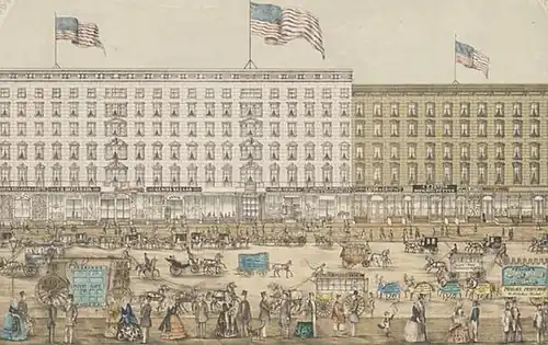 The St. Nicholas Hotel was a 600-room, mid-nineteenth century luxury hotel on Broadway in the neighborhood of SoHo in Manhattan, New York City.[1] It opened on January 6, 1853, and by the end of the year had expanded to 1,000 rooms.[2] The St. Nicholas raised the bar for a new standard of lavish appointments for a luxury hotel.[3] It was the first New York City building to cost over US$1 million.[2][4][5] The hotel was said to have ended the Astor House's preeminence in New York hostelry.[6]