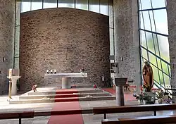 Wörsdorf had only few Catholic inhabitants until the end of World War II, when many people arrived as refugees who were expelled from Silesia, East Prussia, Sudetenland and Hungary. They were transported by bus to church services in St. Martin, Idstein.[1] Plans to build a local church resulted in a 1959 commission to Johannes Krahn,[1] who built several churches and early skyscrapers such as the Beehive House in Frankfurt am Main. It was first also meant to serve as a Autobahnkirche for the near-by highway.[2] That purpose had to be given up when a planned exit was not approved.[2] Construction began in 1961,[1] and the church was consecrated on 8 December 1962. It was dedicated to Nicholas of Flüe, and named Friedenskirche ("Peace Church").[1][3]