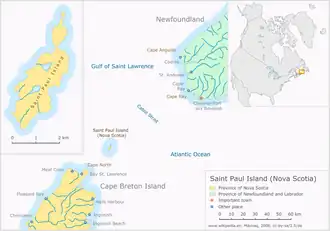 St. Paul Island (French: Île Saint-Paul) is a uninhabited island located approximately 24 km (15 mi) northeast of Cape North on Cape Breton Island and 71 km (44 mi) southwest of Cape Ray on Newfoundland; it is along the boundary between the Gulf of St. Lawrence and the Cabot Strait.