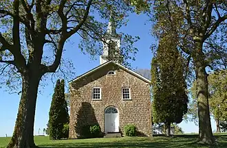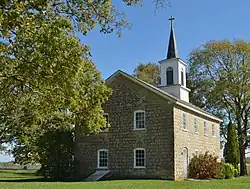Land for the church building was purchased for $30 an acre from Eli Carlan.[2] Gerhard Bierbaum deeded another acre for a total of 6.16-acre (2.49 ha). The church members quarried the stone from the Bierbaum quarry. The cornerstone for the church was laid on October 25, 1858. The building measures 55 by 30 feet (16.8 by 9.1 m), with the 12-foot (3.7 m) length in the back reserved for the pastor's quarters. The structure was built for less than $1,100.[2] A well of 35 feet (11 m) deep and 5 feet (1.5 m) in diameter was dug by Sebastian Walsh for a $1.00 a foot until he hit rick and then he was paid $1.15 a foot.[2]