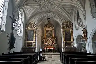 The church features Baroque furnishings including the high altar from 1655, with a main painting by Kaspar Amort: Das Martyrium der heiligen Ursula und ihrer Gefährtinnen, focused on St. Ursula.[1] Sculptures of St. Sylvester and St. Benno, the patron saint of Munich, were created by Matthias Schütz, probably in 1673.[1] A group of sculptures depicting the Annunciation has been attributed to Ignaz Günther or his school.[1][4] This and other works by the same school were acquired in 1770, also a figure of Judas Thaddäus, and busts of St. Benedict and St. Barbara.[1][4] Two statues by Constantin Pader, of St. Nicholas and St. Elisabeth, dated to 1647, were moved to this church in 1898 from the then demolished "Leprosenkirche" St. Nikolaus in Schwabing.[1]