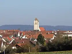 The County Palatine of Tübingen were the patronage lords of the church until the late 14th century. This function was taken over in 1382 by the House of Württemberg, which in 1456 transferred the associated rights to Herrenberg abbey, into which the church was incorporated in 1457.[1] After the exiled Duke Ulrich returned to Württemberg in 1534, he soon introduced the Reformation and Protestant worship. The House of Württemberg had the monasteries and convents in its domain dissolved and again exercised church rights directly itself. The Protestant regional church took over the last Catholic pastor, Eustachius Kain, into its service.[5]