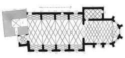 The main entrance to the church is in a small porch on the tower and west wall of the nave with an almost square floor plan, oriented like the tower. The nave is just under 20 meters long and a little over 12 meters wide, including the inset chapels. It is divided into four bays by three buttresses on each long side. The west wall of the nave is the only wall of the nave oriented like the tower and porch; the interior buttresses do not abut the wall of the nave at right angles, but mediate between the two different orientations. There are inset chapels with their own vaults in the spaces between the buttresses.[6]