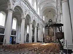 The white marble communion rails were made by Hendrik Frans Verbrugghen in 1695. These rails are a high point of Flemish Baroque sculpture. Because of the virtuoso treatment of the marble they appear to be modeled in wax.[3] The confessionals in classicizing style date from 1802. The oak choir stalls and communion rails are from the 18th century. The Baroque pulpit is a work of Artus Quellinus II (1670) and was made on the basis of the iconography of Willem Hesius.