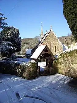 The church was built as a chapel-of-ease to St Germans parish church in 1832 to support the growing population of Hessenford.[4] It was consecrated the following year.[5] Although there is a small tower and spire, there has never been a bell, and the church became renowned for its shotgun weddings as a volley was fired in place of a peal.[6] A newspaper report in 1930 pictured local farmers firing a salute of one hundred rounds in celebration of a wedding.[7] The church became a separate parish in 1851, with the Rev John Turner Fisher as the first Vicar.