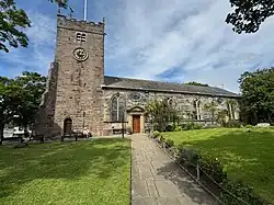 The tower at the west end of the church dates from the early 17th century.[20] It sits next to the south-west corner of the nave, aligned with the south wall, because the former church plan included a north aisle;[17] the north wall of the tower meets the nave at its roof ridge.[26] It is castellated and constructed of coursed roughly-dressed stone. It has two diagonal buttresses, two angled buttresses and four corner pinnacles. There are slate belfry louvres on each side of the tower and clock faces on the north and south sides.[1][26]