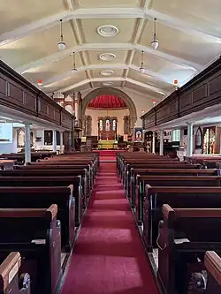 Internally, the nave measures 93 feet 6 inches (28.50 m) by 36 feet (11 m), the chancel (including apse) measures 20 feet (6.1 m) by 17 feet 6 inches (5.33 m) and the tower measures 12 feet (3.7 m) by 12 feet (3.7 m).[1] The ceiling of the church has shallow ribbed vaulting.[17] There are galleries to the north, west and south, accessed by a Georgian staircase in the north-west that has turned balusters.[17][29] The north and south galleries are supported by plain Tuscan columns and both contain box pews that date from 1752.[17] Stained glass dates from the late 19th century to the mid-20th century and includes work by Lancaster designers Shrigley and Hunt.[17] The pulpit was constructed in 1955 in the Jacobean style from the four sides of a 17th-century pulpit. It has arabesques and a portion of an inscription from the Book of Isaiah.[17]