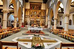 John Francis Bentley added a reredos, high altar and communion rails in 1870/73. The reredos, which is thirty feet high, has two tiers of saints painted on slate by Nathaniel Westlake. The frontal for the Lady Chapel altar was added in 1879.