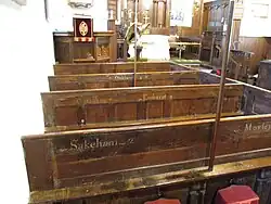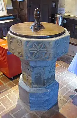 The octagonal font has been variously dated to c. 1300, the 14th century and the 15th century. It is decorated with alternate quatrefoils and star shapes.[10][4][17] There are several Neoclassical memorial tablets, notably one to John Challen (died 1794) by the Lewes statuary Latter Parsons.[18][19] St Giles is one of relatively few Sussex churches – others include Warminghurst, East Guldeford, Chiddingly and Penhurst – where box pews still survive.[20][21] They date from c. 1747, and like the rather later pews of St George's Church, West Grinstead, they carry the names of the local farms to whose use they were appropriated.[4][17] The painted Royal Arms are, unusually, those of Queen Anne.[19] They date from the 1710 restoration of the church.[10] The church plate all dates from the late 17th century or early 18th century, and includes a silver gilt communion cup of 1686.[22] It is recorded that there were three bells in the 18th century, but today there are only two.[17]