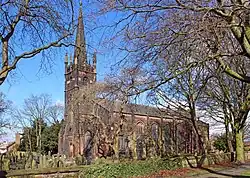 The architects were Williams and Edwards[2] and it was built by Richard and Paul Barker[3] of Huyton in red ashlar sandstone.[4] There is a narrow west tower with recessed spire and thin polygonal buttresses. It has tall church sides with three light perpendicular windows and thin buttresses. The taller chancel with south chapel is an 1890 addition by Aldridge and Deacon. There is an excellent late 19th century Celtic cross in the churchyard, finely carved. The churchyard contains war graves of three soldiers, a Royal Navy sailor and a Royal Air Force officer of World War I and three soldiers and an airman of World War II.[5]