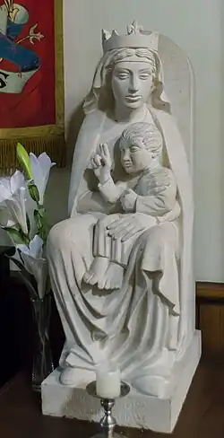 A madonna and child statue inside the church