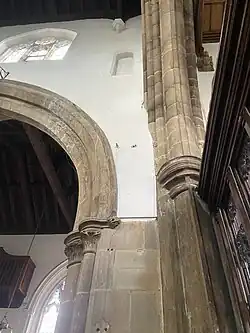 It is possible that at least a south aisle, and possibly a north one too, were added sometime during the later 1100s. This would explain the odd double capital of the transept pillars in the easternmost bay of the nave, where the originally shorter south arcade was heightened during later 13th century reconstructions. The northern arcades parallel moulding is clearly a careful imitation of the southern pier by later builders.[16]