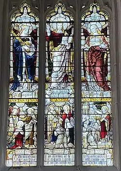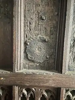 Like most pre-reformation churches in England the life of the laity at St Margaret's was focused on the parish guilds. At St Margaret's, the wealthiest of the two principle guilds was dedicated to the Blessed Virgin Mary and Katherine of Alexandria, like Margaret a virgin martyr and the patron of the nearby St Katherine's Priory perhaps suggesting an Augustinian connection.[9] Founded in 1355 it was probably a replacement to an older guild or guilds which died through reduction of membership during the plague. The purpose of the institution was provision for a good burial and proper chantry commemorations for its dead members, a mutual aid society for its living members, a social club, and a devotional religious society. Initially founded with the modest intention of finding two priests to say mass just twice a year for the souls of its departed members, the Guild of St Katherine soon grew wealthy enough to maintain an altar in the parish church (probably in the north aisle), a large communal guild hall on the east side of Church Gate, and two full time chaplains on a generous stipend of £10. 13s. 4d. per annum (roughly £3,000 today). At the time of the dissolution of guilds it had assets of £20. 10s. 1.5d. (roughly £5,600 today) and made a profit of nearly £7 per annum. When the guild was dissolved the land was divided between Edward Pease and James Wylson and part, at least, of the land to Robert Catlyn.[8] Today a remnant of the Guild of St Katherine is still visible in the church in the form of a large wooden chest bearing the distinctive wheel emblem of Katherine of Alexandria.[9]