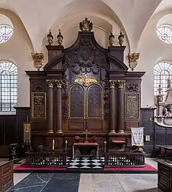 The pulpit is by William Grey, and the door cases, a font cover, rails and Royal Arms are by William Emmett. Its grand altar-piece is by Grinling Gibbons.[15] Gibbons' original bill for what he called the 'Olter Pees' was rediscovered in the Guildhall Library in 1946. The motif of the gilded 'Pelican in her piety' (the emblem of Corpus Christi College, Cambridge) makes its appearance both on the reredos and in the original copper weathervane made by Robert Bird, which was relocated to sit over the north door after being removed from the spire for safety reasons. Also to be seen there are original high box pews on three sides of the church. The church was without an organ until 1822, when public subscription allowed one to be built by J.C. Bishop. This sustained serious bomb damage during the Second World War and a new organ was made by N. P. Mander in the 1950s, using the 1717 organ casing once belonging to All Hallows, Bread Street.[16]