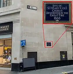 The Great Fire destroyed 86 of the 97 parish churches in the City of London.[6] By 1670 a Rebuilding Act had been passed and a committee set up under Sir Christopher Wren to plan the new parishes.[7] Fifty-one were chosen, but St Mary Colechurch was one of the minority not to be rebuilt.[8] The parish was united with St Mildred, Poultry, although the parishioners objected on the grounds that