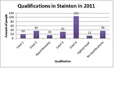 In the parish of Stainton there are 255 members who are 16 and over.[12] As the Graph shows 219 of these have qualifications between level one and the highest level of qualification including apprenticeships. As the graph shows, 105 people who live in the village have gained a level four qualification which is the greatest percentage at 41.2% of the total number.[12]Out of 255 people, 36 in the parish have no qualifications.[12]