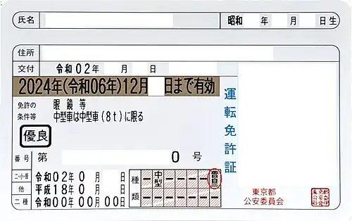 Japanese driving licence sample with category for ordinary motorcycle (普自二) circled.
