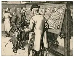 In the early inter-war years Anderson's work was mainly composed of portraits, landscapes and street scenes. From the 1920s he began to add social comment and ironic commentary, which increased in the 1930s as his work became more mature and began to reflect his growing disillusionment with modern life.[1] This can be seen in Wreckage (1922),[6] By-Products (1922),[7] in the tramp-like figures lounging in The National Gallery (1925),[8] and in the flute playing busker in Pan in Fulham (1932).[9]
