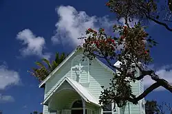 Father Evarist Gielen was the serving priest in the district of Puna, Hawaii between 1927 and 1941, constructing a number of churches during his time on the island. He constructed the church at Kalapana shortly after his arrival in 1927, with it being completed in 1928. The church is approximately 22 by 36 feet (6.7 m × 11.0 m), constructed from wood with a corrugated metal roof.[2] Father Evarist painted the interior of the church himself, using housepaints and linseed to cover the walls with images of Bible stories, and Hawaiian and Catholic history.[3][4] Additionally, the church has two stained glass windows, depicting Hawaii's saints, Father Damian and Marianne Cope, who both helped to cure leprosy on Molokai.[5]Additional paintings were added in the 1960s by George Heidler and in the 1970s George Lorch.[6]