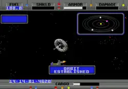 The player begins inside a space station called Starport orbiting the planet Arth.[5][6] Here they buy and sell minerals, Endurium (fuel), and artifacts, recruit and train crew members, and upgrade parts of the ship.[7] The player hires a crew from five species[1] to man the ship's six posts: navigator, science officer, engineer, communications officer, doctor, and captain.[8] A crewman's proficiency is determined by the relevant skill: a science officer with a high science skill can determine more of a planet's properties and detect aliens at a greater range, for example. Skills are increased through training, which must be purchased.[9] One crewman can man multiple posts,[10] but different species have different maximum skill levels.[11] The ship is initially equipped only with engines and a limited supply of Endurium,[5] a type of crystal used as fuel.[12] The ship can be modified and upgraded through the purchase of weapons, armor, and shields.[13]