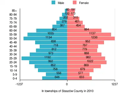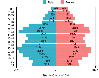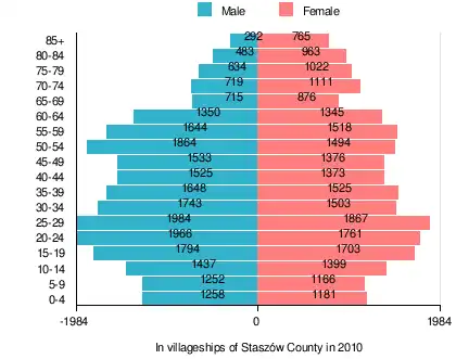 According to the 2011 Poland census, there were 73,125 people residing in Staszów County, of whom 49.5% were male and 50.5% were female (out of which the population in townships amounts to 25,336, of whom 48.8% were male and 51.2% were female; and the population of the villageships part of the county is 47,789, of whom 49.9% were male and 50.1% were female). In the county, the population was spread out, with 19.8% under the age of 18, 38.7% from 18 to 44, 24.5% from 45 to 64, and 17% who were 65 years of age or older (out of which the population in rural areas amounts to 19% under the age of 18, 39.1% from 18 to 44, 28.2% from 45 to 64, and 13.7% who were 65 years of age or older; and the population of the villageships part of the county is 20.3% under the age of 18, 38.5% from 18 to 44, 22.6% from 45 to 64, and 18.7% who were 65 years of age or older).[1]