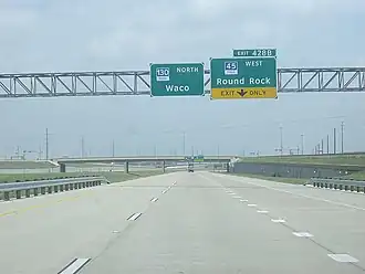 State Highway 130 (SH 130), also known as the Pickle Parkway, is a freeway and toll road in the U.S. state of Texas. It runs parallel to Interstate 35 (I-35) in San Antonio along I-410 and I-10 to east of Seguin, then north as a toll road from there to I-35 north of Georgetown.[1] SH 130 runs in a 91-mile (146 km) corridor east and south of Austin. The route parallels I-35 and is intended to relieve the Interstate's traffic volume through the San Antonio–Austin corridor by serving as an alternate route.