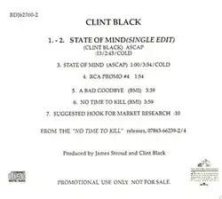 "State of Mind" is a song written and recorded by American country music artist Clint Black. It was released in November 1993 as the third single from his album No Time to Kill. It peaked at number 2 in both the United States and Canada.