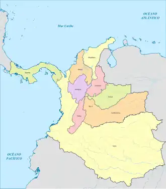 The United States of Colombia was divided into nine federal states, called "sovereign states" under the constitution of 1863. The internal territorial division of the states were defined by the legislature of each state. The states were as follows:[6]