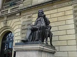 In 1851, Theobald Stein won Neuhausen's Prize (De Neuhausenske Præmier) with a half-size portrait statuette of Ludvig Holberg. The other participants in the competition were Otto Evens, Thorvald Mule and August Saabye.[3] In the early 1870s, Stein was commissioned to create a colossal version of this early work for the new Royal Danish Theatre on Kongens Nytorv. Together with Herman Wilhelm Bissen's 1861 statue of Adam Oehlenschläger, which had until then been located on Sankt Annæ Plads, it was supposed to flank the main entrance of the new theatre building. honouring what was regarded as the two founding fathers of Danish theatre. Since Bissen's statue of Oehlenschläger also depicted him seated in a chair with a book, Stein saw a need for his Holberg statue to stand out from it more clearly. On Wilhelm Marstrand's advice, he therefore chose to add a walking stick to the composition.[2] The new building for the Royal Danish Theatre was inaugurated on 15 October 1984. The Ludvig Holberg statue was unveiled on 31 October 1875. An incidental song by Hans Peter Holst was performed at the event.[2]