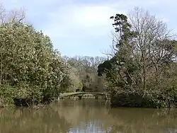 The park contains a lake called Leigh water.[15] Prior to its construction the site was home to a pond a few yards in diameter.[16] Its initial construction of the lake took place between 1828 and 1836.[15] A three arched bridge known as the Chinese Bridge was built in 1830[15] and in 1832 two buildings were added; a boathouse apparently built to a Chinese design and a pergola.[17] In either 1832 or 1834 an ornamental kiosk was added to the lakeside.[18] It featured an onion dome surrounded by small minarets. In 1835 a Chinese-themed summer house was built by the site of the lake.[18]