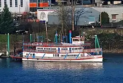 Another sidewheeler on the Willamette River at this time was the Mississippi-style Wallamet, which did not prosper, and was sold to California interests.[6] In 1853, the side-wheeler Belle of Oregon City, an iron-hulled boat built entirely in Oregon, was launched at Oregon City. Belle (as generally known) was notable because everything, including her machinery, was of iron that had been worked in Oregon at a foundry owned by Thomas V. Smith. Belle lasted until 1869, and was a good boat, but was not considered a substitute for the speed and comfort (as the standard was then) of the departed Lot Whitcomb.[6]