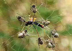 Larger spiders are more likely to take part in cooperative prey capture.[8] During capture, many females will engage with the prey at the same time, injecting their digestive juices into the prey through extra-oral digestion. These digestive enzymes break down the prey into a liquid for other spiders to share, or for females to regurgitate to spiderlings.[9]