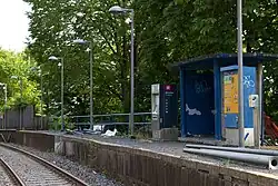 Steinerud is a rapid transit station situated on the Holmenkollen Line, 3.8 kilometers (2.4 mi) from Stortinget in the city center. It is situated at an elevation of 75.6 meters (248 ft) above mean sea level.[7] The platforms are much shorter than the norm for the metro and only have space for two cars. They are parallel and were both originally built in granite. They have since been raised and lengthened with concrete, wood and asphalt. On the platform serving trains towards the city center there is a prefabricated shed designed by Telje-Torp-Aasen. It is built on a foundation which indicates that a wooden shed designed by Erik Glosimodt was to be placed there, but it is uncertain if this structure was ever built. Just north of the platforms is a level crossing for pedestrians.[2]