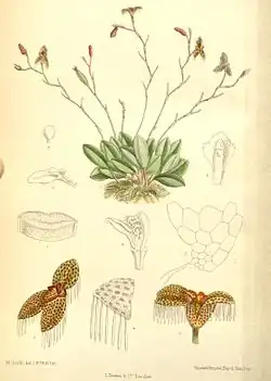 Stelis ornata is a species of orchid found from Mexico through Guatemala and El Salvador as a miniature epiphyte at elevations of 1500 to 2500 meters above sea level.[1] The plant is characterized by erect ramicauls enveloped by two basal sheaths and carrying a single apical, erect, coriaceous leaf where it blooms on an apical, single successive flowered, 2 inch [4 to 5 cm] long, fractiflex inflorescence that holds the successive opening, single flowers amid or just above the leaves occurring at any time of the year. In cultivation it prefers cool temperatures, shade, and high humidity as well as mounting on tree fern, and good air movement.