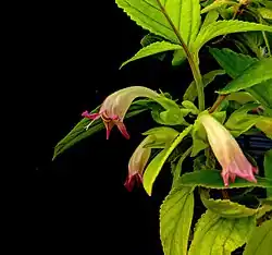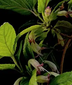 This Hawaiian mint is a woolly vine which can reach 1 or 2 meters in length. The woolly leaves are up to 14 centimeters long by 4.8 wide. The plant produces tubular flowers which may be over 4 centimeters long. They are white or yellowish with purple-pink lips.[1] The plant reproduces vegetatively, rooting where the stems contact the substrate and growing up new, cloned plants.[3]